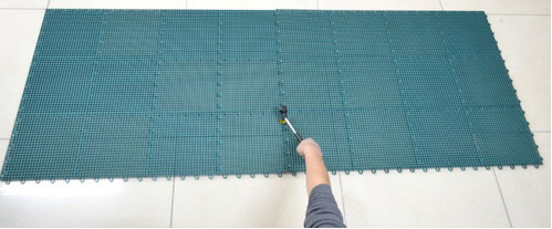 地面基礎:在基礎堅實、平整的基礎上均可。3米直尺范圍內誤差不超過5毫米。懸浮式拼裝地板安裝前先將地面清掃干凈;安裝時請按場地的長寬用滑石粉彈好 線,以此定位地板的安裝位置,彈線完成后貼上美紋紙,然后用專用油漆進行劃線;再依次把銷和孔對齊后用橡皮錘敲擊地板接縫便可安裝成功。