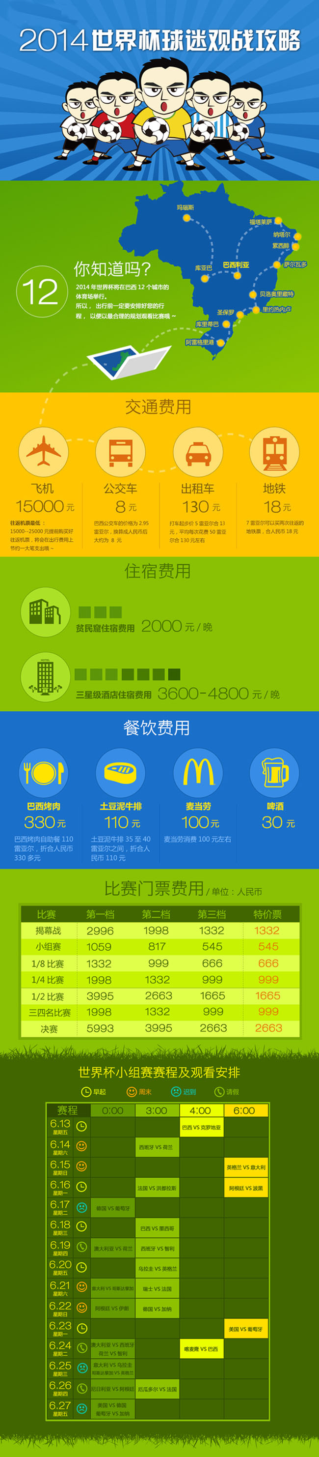 2014巴西世界杯的腳步聲越來越近了,此刻仿佛已經聽到2014世界杯的主題曲《 We Are One》(我們是一家人)。作為資深球迷的朋友們的福利來了,小編為大家整理了世界杯賽程、住宿等觀戰攻略,2014巴西世界杯觀戰必不可少的利器。