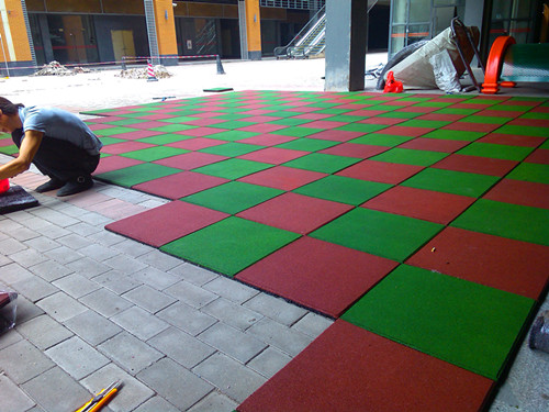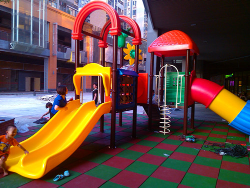 兒童游樂場地面考慮到兒童安全,都必須使用安全地墊,可選橡膠安全地墊或EPDM顆粒地墊。佛山創(chuàng)意產(chǎn)業(yè)園業(yè)主居住活動場區(qū)域采用25mm橡膠地墊鋪設(shè),上面為兒童樂園組合滑梯。